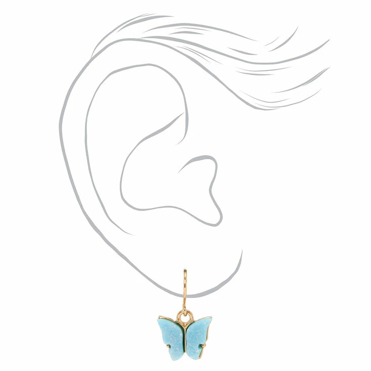 Look as charming as a butterfly with these earrings! This set of drop earrings includes three pairs with a butterfly charms dangling from each in pink, blue, and white.