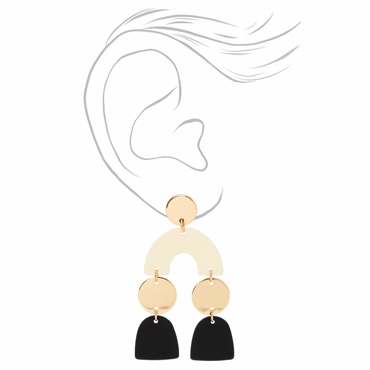 Geometric earrings will never go out of style and this pair is a must-have! Featuring gold-tone, white, and black geometric pieces hanging from each round post, these drop earrings will add the perfect pop of neutral detail to any look.