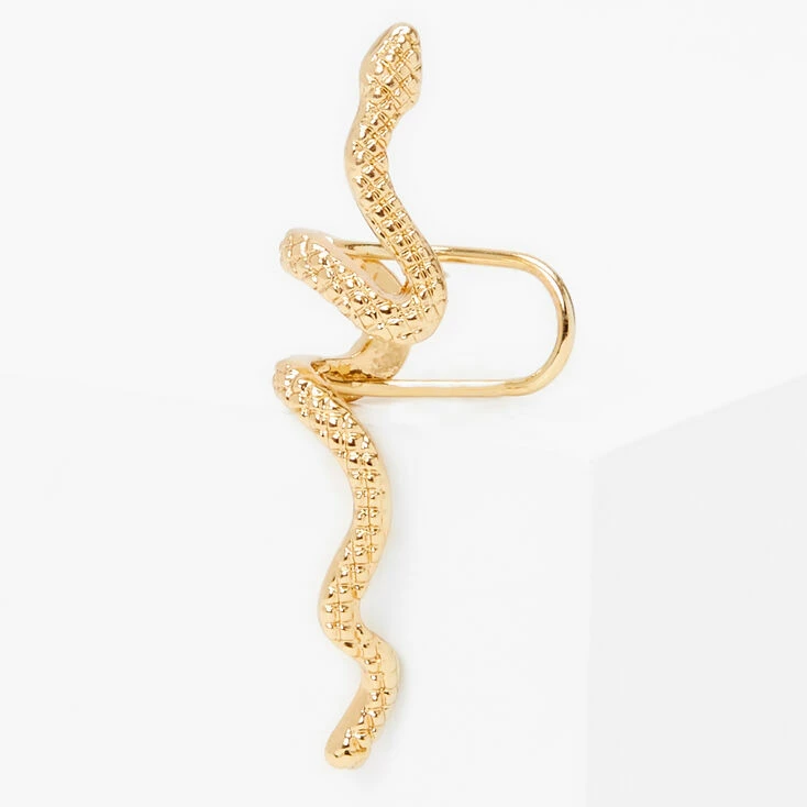 This trendy gold-tone ear cuff will slither around your ear just like a snake! Perfect for adding an edgy vibe to your look, this shiny snake with textured scales attaches comfortably onto your ear cartilage.