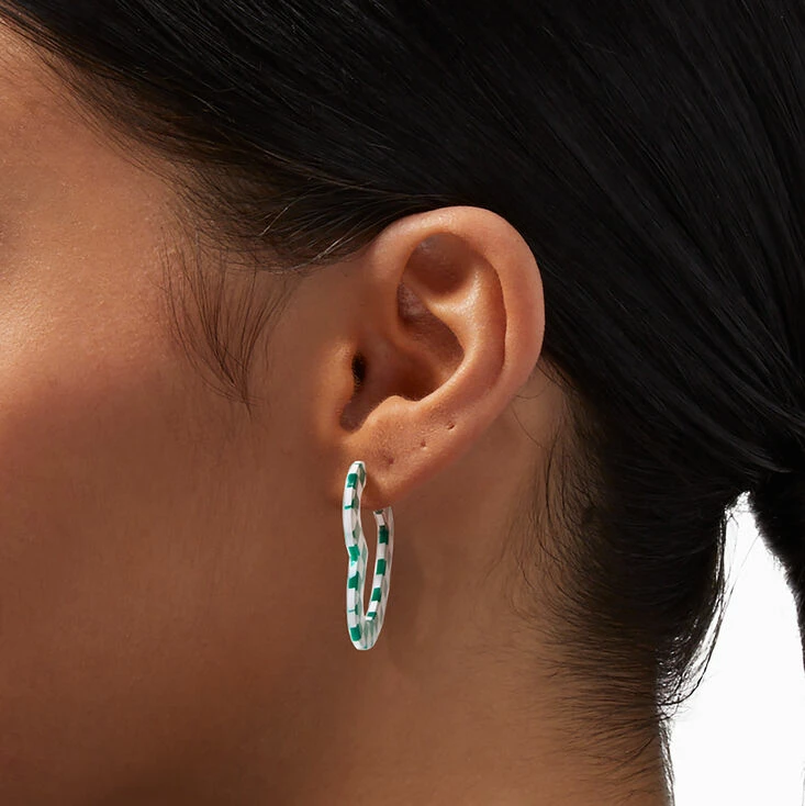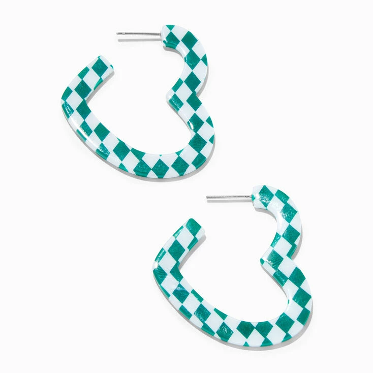 Give your look some heart with these hoop earrings. They have a cutout heart designs that are covered in a fun green checkered print for a punky pop.