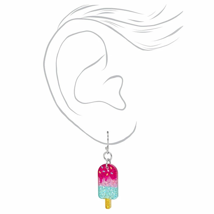Create a super sweet moment with drop earrings. Each fish hook closure has a multi-coloured glitter popsicle charm hanging from it, perfect for hot summer days or a trip to the ice cream shoppe.