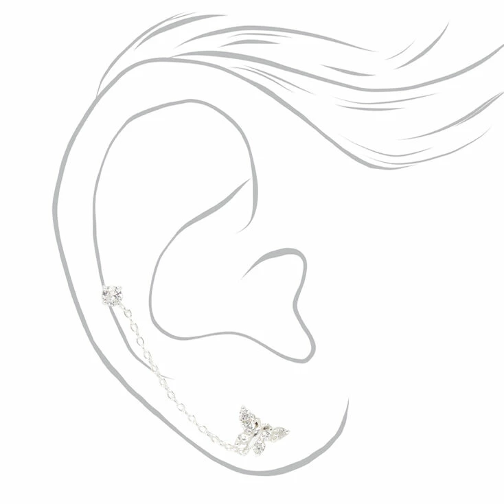 Make a springtime connection with these cool silver-tone earrings that earn added points for style. Two butterfly studs; one stud is linked by a delicate chain to a shiny three-row cuff that clips easily onto your ear cartilage with no additional piercing required.