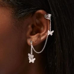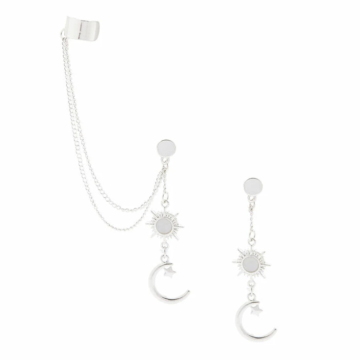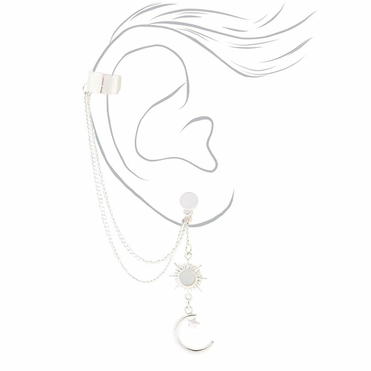 Add out of this world charm to your outfit with this shiny chain ear cuff. A wide silver cuff is attached to a drop earring by a thin double chain. The other earring in the pair is a drop earing with the same sunburst and crescent moon charms.