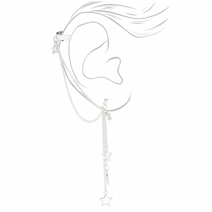 Make a star-studded connection with these silver-tone earrings that earn added points for style. This pair of studs features dangly open-star charms hanging from chains, and one stud is linked by chains to a cuff that clips easily onto your ear cartilage with no additional piercing required.