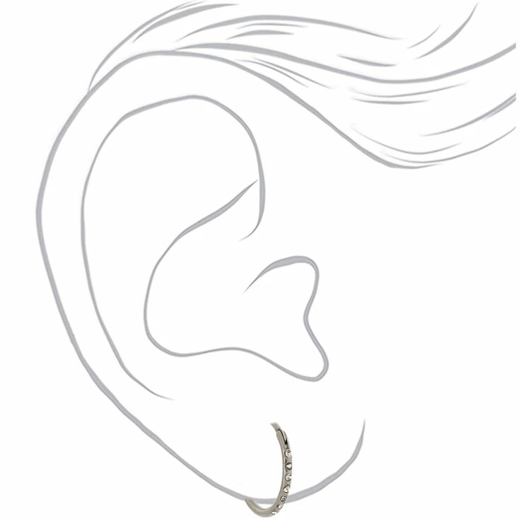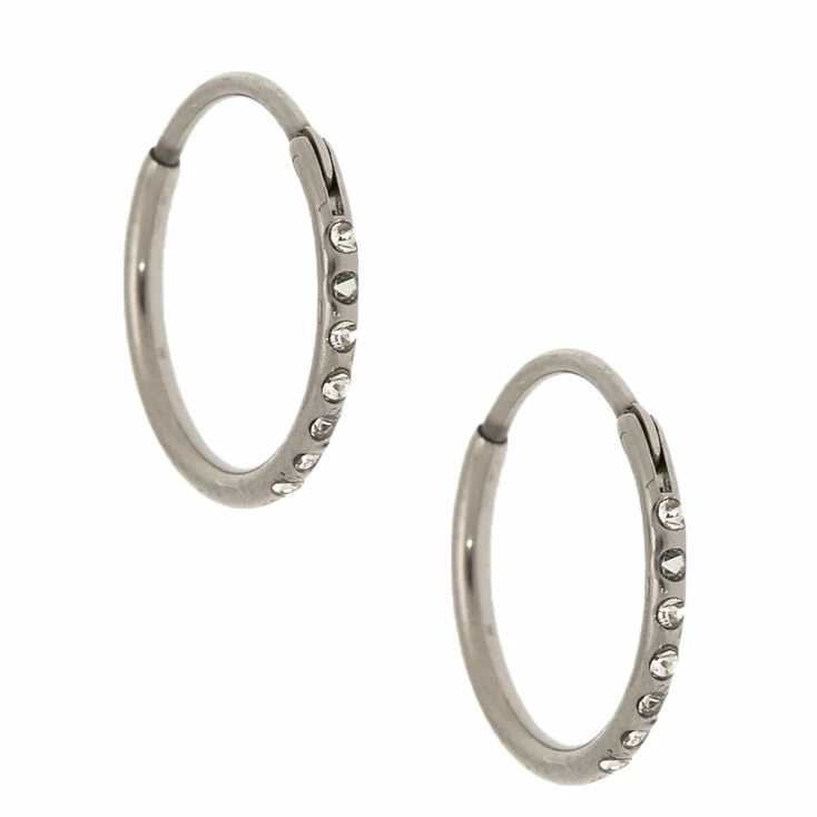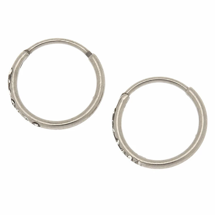 Keep it simple with a sleek pair of hoop earrings! These silver-tone titanium hoops feature an easy clicker hinge closure with sparkly faux crystals along the side of each hoop.